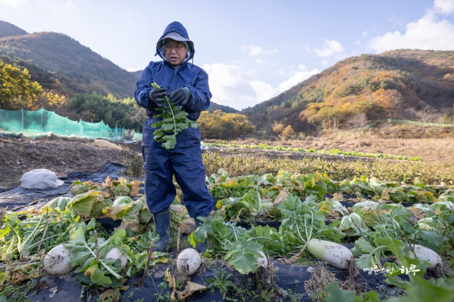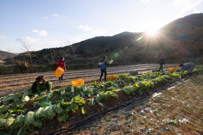 먼저 산 아랫 밭으로 올라가서 배추를 수확했습니다.