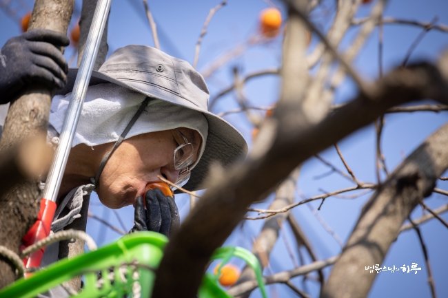 나무 위쪽에는 더 많은 감이 주렁주렁 달려 있었습니다. 햇살이 눈부셔서 감이 잘 안 보였지만, 최대한 팔을 뻗쳐 감따개 안에 감이 달린 가지를 끼웠습니다.