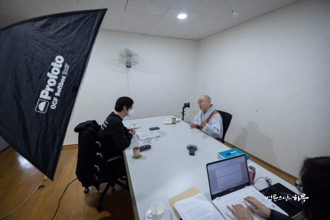 이어서 오전 9시부터는 한겨레신문과 인터뷰를 했습니다. 만일결사 회향과 관련하여 각 언론사에서 취재 요청이 종종 들어오고 있습니다. 글을 쓰는 분과 사진을 찍는 분, 두 명이 서울 정토회관을 찾아왔습니다.