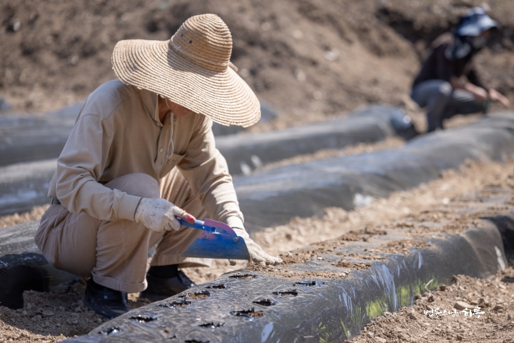 “우엉 씨앗을 두 줄 심어주시면 됩니다. 20cm 간격으로 주욱 심어 나가시면 돼요. 한 구멍에 우엉 씨앗 3개씩 넣어주세요. 마지막에 구멍 속으로 바람이 들어가지 않게 흙으로 덮어주시면 됩니다. 바람이 들면 수분이 다 날아가게 되거든요.”