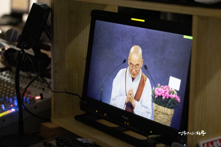 저녁 7시 30분이 되자 스님은 다시 방송실 카메라 앞에 자리했습니다. 저녁반 전법활동가들이 화상회의 방에 모두 입장하자 오전 법회처럼 스승의날 행사를 먼저 진행했습니다.