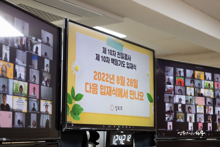 “오늘은 제10차 천일결사 8차 백일기도 회향일입니다. 지난 100일을 돌아보면서 처음 입재해서 100일 동안 빠지지 않고 수행정진해 온 신규 입재자 여러분께 진심으로 축하를 드립니다.