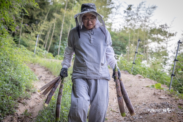 낮에는 기온이 32도까지 올라가서 무더웠습니다. 뙤약볕을 피해 오후에는 여러 가지 업무들을 처리했습니다. 해가 질 무렵 오후 5시에 스님은 작업복을 입고 산 윗밭으로 올라갔습니다.