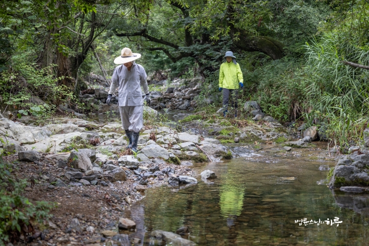 일을 본격적으로 시작하기 전에 스님은 이미 땀을 흠뻑 흘렸습니다. 땀을 닦고 계곡 아래에서 공양을 하고 울력을 시작했습니다.
