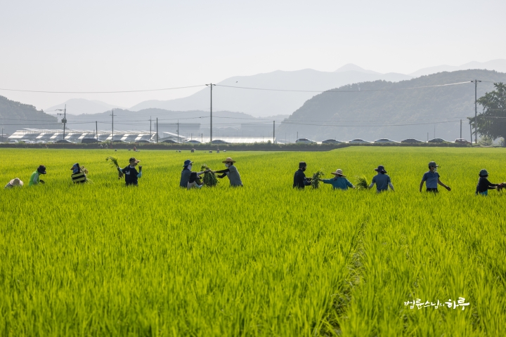 방송실을 나온 스님은 곧바로 작업복을 갈아입고 논으로 나갔습니다. 오늘은 대중들 120여 명이 와서 함께 논에 들어가 피 뽑기를 하기로 한 날입니다.