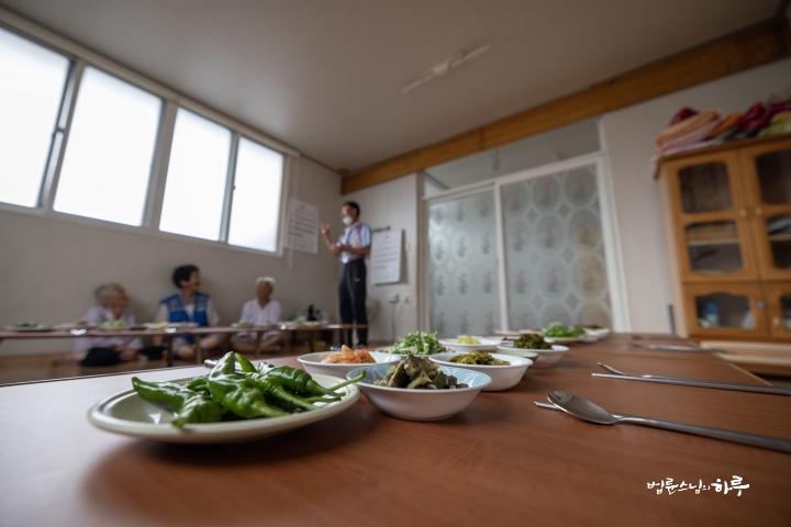 “원래 어제가 말복이었잖아요. 느티나무 아래에서 식사 대접을 해드리려고 풀을 깨끗이 깎아 두었는데, 오늘 비가 오는 바람에 이렇게 경로당에 상을 차렸습니다. 맛있게 드세요.”