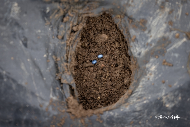 파종기로 땅을 찍는데 돌이 쾅 부딪혔습니다. 스님은 호미로 큰 돌을 빼내가며 계속 유박을 주었습니다.
