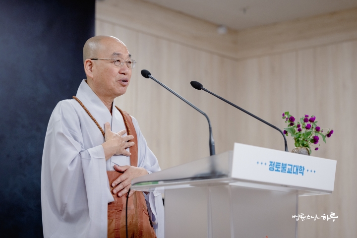 “정토불교대학생 여러분, 졸업을 진심으로 축하합니다. 역사 속 어느 시기를 봐도 늘 혼란이 있었지만, 우리가 살아가는 시대는 특히 여러 혼란이 뒤섞인 종합판으로 볼 수 있습니다. 부처님께서는 밥은 얻어먹고, 옷은 주워 입고, 잠은 나무 밑에서 자면서도 행복했고 자유로웠습니다. 나아가 주변 사람들에게 많은 도움을 주면서 살아가셨습니다. 지금 우리가 아무리 못 먹는다고 해도 부처님보다는 잘 먹고, 아무리 못 입는다고 해도 부처님보다는 잘 입고, 아무리 잠자리가 불편하다고 해도 나무 밑보다는 낫잖아요. 그러니 더 좋은 음식을 먹고, 더 좋은 옷을 입고, 더 넓은 집에서 자려고 껄떡거리지만 않는다면, 오늘날 우리 삶의 조건은 그리 나쁜 편이 아닙니다.