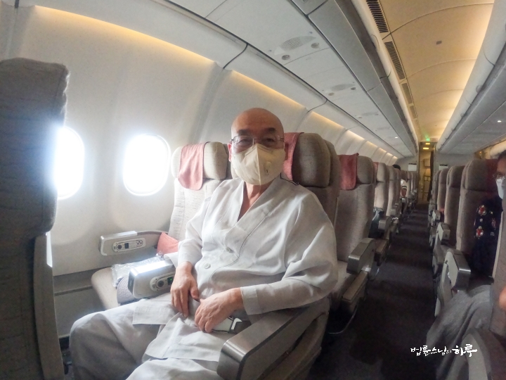 비행기에 탑승해서 자리를 잡고 앉으니 스튜어디스가 스님을 찾아와 반갑게 인사를 건넸습니다.