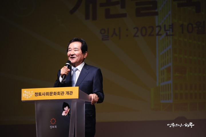“오늘 이 자리에 와서 보니 여러분이 하고자 하는 ‘세상을 행복하게 만드는 일’이 가능하겠다는 희망을 느꼈습니다. (모두 박수) 노동자와 기업인, 여와 야, 수도권과 지방 등 여러 가지 갈등이 있는데, 갈등이 완화되고 해소되는 평화로운 세상이 와야 우리 모두 행복해질 수 있을 거라 생각합니다. 이곳 정토사회문화회관에서 새로운 역사가 만들어질 수 있도록 우리가 힘과 정성을 보태고, 특히 다음 세대가 더욱 행복하고 잘 사는 대한민국을 만드는 데 함께 기여합시다.”
