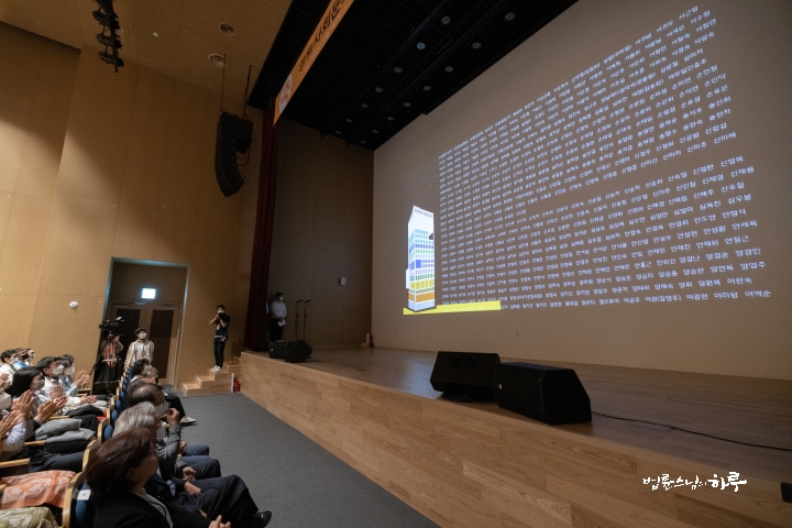 먼저 개관식 기념 영상을 본 후 모연을 해준 분들에 대한 감사 영상을 보았습니다. 마지막에 모연에 동참한 모든 분들의 이름이 자막으로 올라가자 큰 박수갈채가 쏟아졌습니다. 지난 30년 간 정토행자들이 함께 걸어온 발자취가 정말 아름답게 느껴졌습니다.