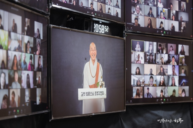 해마다 여의도에서 열리던 강연이 코로나 확산 이후 3년째 온라인으로 진행되고 있습니다. 스님은 두북 수련원에 마련된 방송실에서 200여 명의 방송·영화·연극인들과 온라인으로 만났습니다.