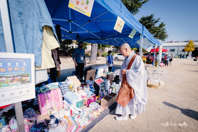 방송을 마치고 나온 스님은 다시 운동장으로 나와 나비장터와 김장축제를 한 바퀴 둘러보았습니다. 올해에는 물품의 종류와 코너가 작년보다 더욱 다양해졌습니다. 스님은 기와에 꽃그림을 그리는 코너에 멈춰 섰습니다.