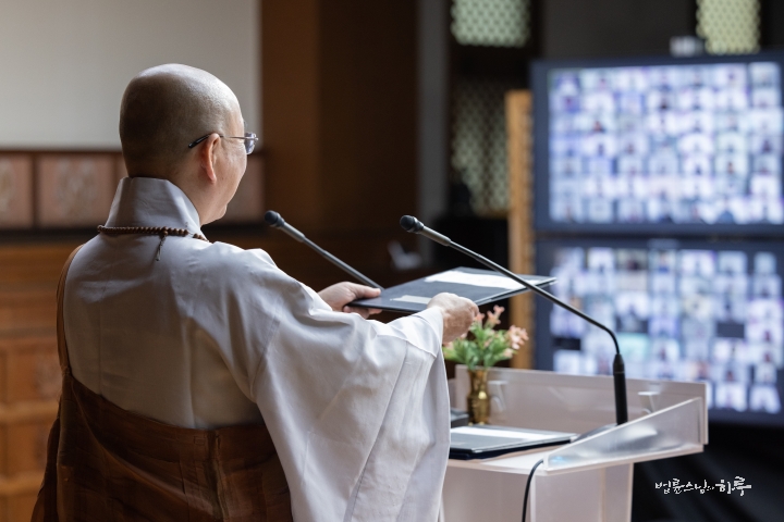 잠시 휴식을 하고 곧바로 10시부터는 온라인으로 정토불교대학 졸업식을 시작했습니다. 오늘은 5개월 여의 공부를 마치고 새로운 시작을 향해 나아가는 뜻깊은 날입니다. 대부분의 졸업생들은 교실별로 생방송을 함께 시청하고, 화상회의 방에는 개근상과 정근상 수상자들이 자리했습니다.