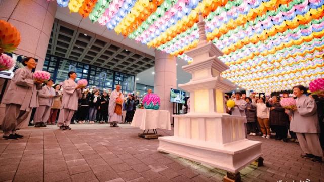 으뜸절에 등불이 모두 켜지자, 화면은 다시 정토사회문화회관으로 돌아왔습니다. 사회자의 선창을 시작으로 대중도 큰 목소리로 외쳤습니다. 탑과 대등에 불이 켜지자 탑을 둘러싼 3백여 명도 저마다 연등불을 밝혔습니다. 이윽고 머리 위에 연등이 환하게 밝아졌습니다.