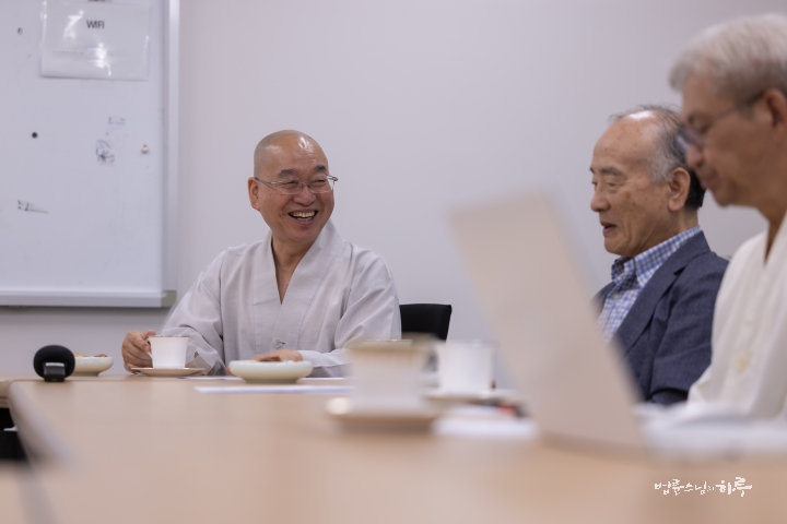 이어서 행복운동 특별본부 사무처 사람들이 찾아와서 스님에게 인사를 했습니다. 얼마 전에 행복학교에 많은 사람들이 신청을 해서 활발하게 운영을 하고 있다며 상황을 보고하고, 스님과 함께 기념사진을 찍고 돌아갔습니다.