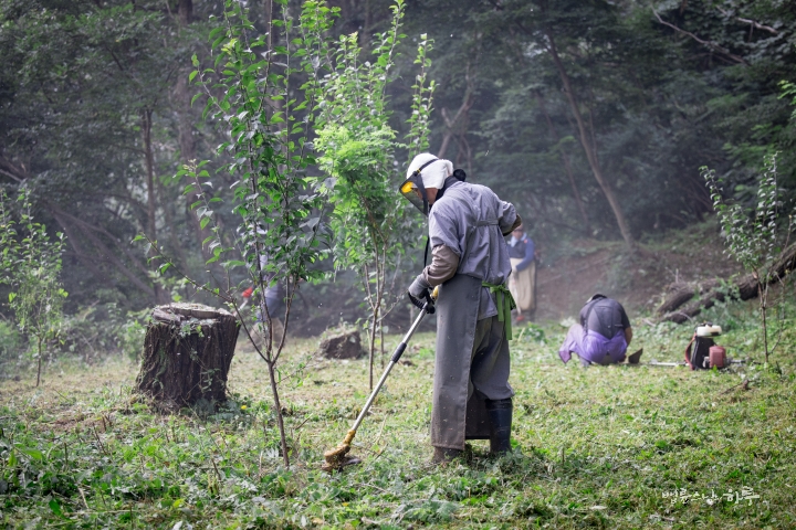 오르막길을 한 번 더 오르면 풀로 뒤덮인 두 번째 과수원이 나왔습니다. 거사님들은 스님과 짧게 인사를 나눈 후 곧바로 예초기 시동을 걸고 사정없이 풀을 베기 시작했습니다. 풀로 뒤덮여 잘 보이지 않던 나무들이 모습을 드러냈습니다.