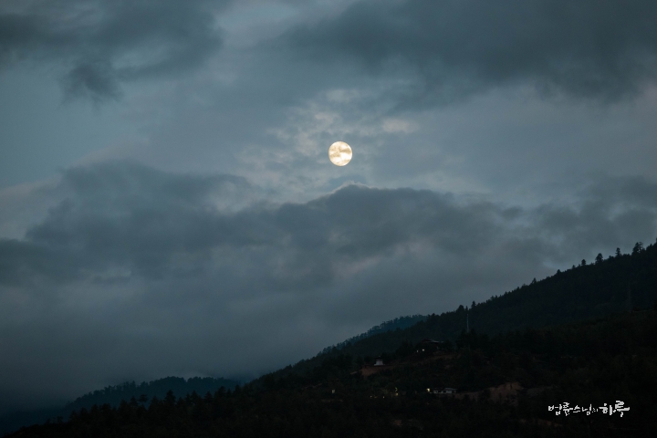 부탄의 캄캄한 밤하늘에는 보름달이 휘영청 밝았습니다. 스님은 손전등을 밝혀 숙소로 돌아왔습니다. 원고 교정을 본 후 잠자리에 들었습니다.