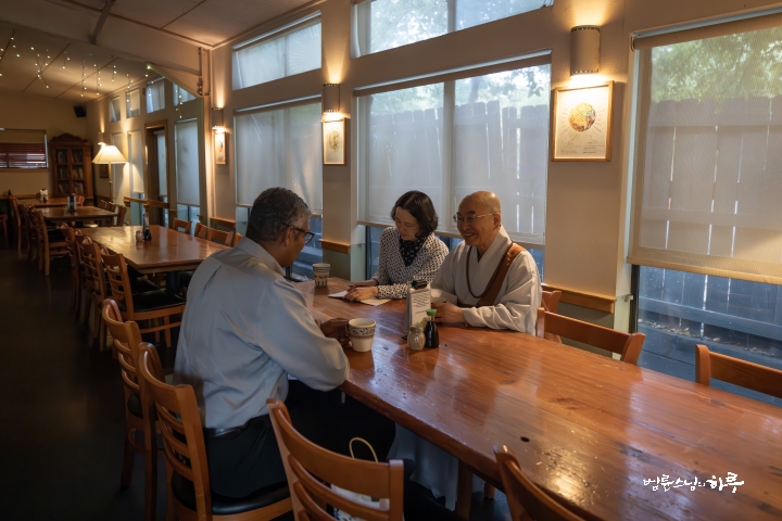 브룩스 님은 스님의 얼굴을 보자마자 너무나 반갑게 악수를 건넸습니다. 함께 카페로 들어가서 대화를 나누었습니다.