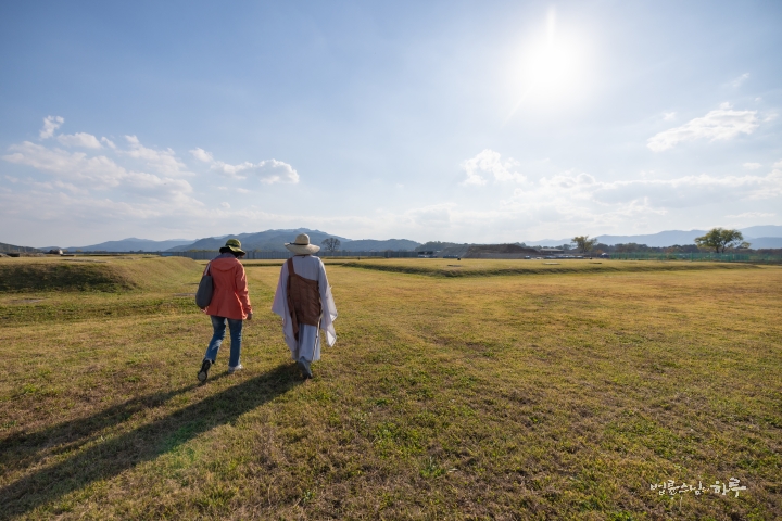 “우리가 도착한 이곳은 우리나라 최대의 사찰, 혹자는 동양의 최대 사찰이라고 하는 ‘황룡사’입니다. 진흥왕 때에 이르러 신라는 한강 유역과 낙동강 유역을 전부 차지하면서 아주 강성해졌지만 당시 궁궐인 반월성은 그 규모가 작았습니다. 그래서 이곳 습지를 메워 궁궐을 지으려고 했어요. 땅을 닦고 습지를 메우는 과정에서 큰 황룡이 나왔다고 합니다. 당시 풍습으로 황룡이 나오는 곳은 사람이 살 곳이 못 되기 때문에 그 기운을 이길 사람은 부처님밖에 없다고 생각해서 궁궐을 짓는 대신 절로 바꿔지었습니다. 그래서 이곳을 황룡사라고 불렀습니다.