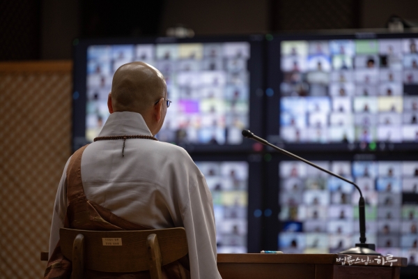 정토회 회원들이 화상회의 방에 모두 입장하자 스님이 인사말을 했습니다.