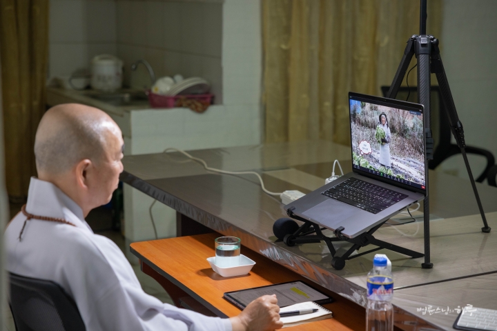 한국 시간으로 저녁 7시 30분이 되자 정토회 회원들이 모두 화상회의 방에 입장했습니다. 삼배의 예로 법문을 청하자 스님이 인사말을 했습니다.