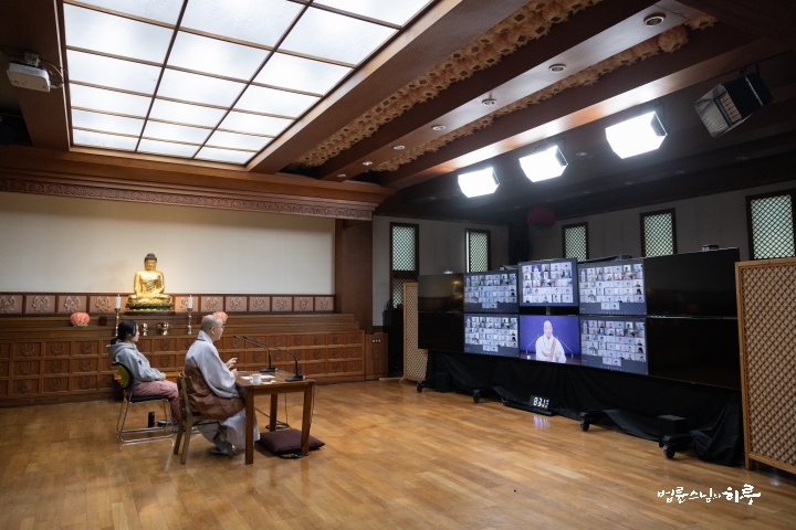 잠시 휴식을 하고 곧바로 10시부터는 온라인으로 정토불교대학 졸업식을 시작했습니다. 오늘은 5개월 동안의 공부를 마치고 새로운 시작을 향해 나아가는 뜻깊은 날입니다. 대부분의 졸업생들은 교실별로 생방송을 함께 시청하고, 화상회의 방에는 개근상과 정근상 수상자들이 자리했습니다.