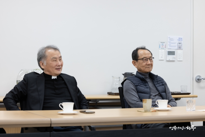 스님은 새벽 기도와 명상을 마친 후 아침 7시에 평화재단으로 향했습니다. 목사님, 신부님, 주교님, 교령님이 모두 도착하자 다 함께 식사하며 모임을 시작했습니다.
