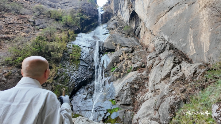 스님은 폭포에 손을 담그고 세수를 한 후 땀을 식혔습니다. 물이 매우 차가웠습니다.