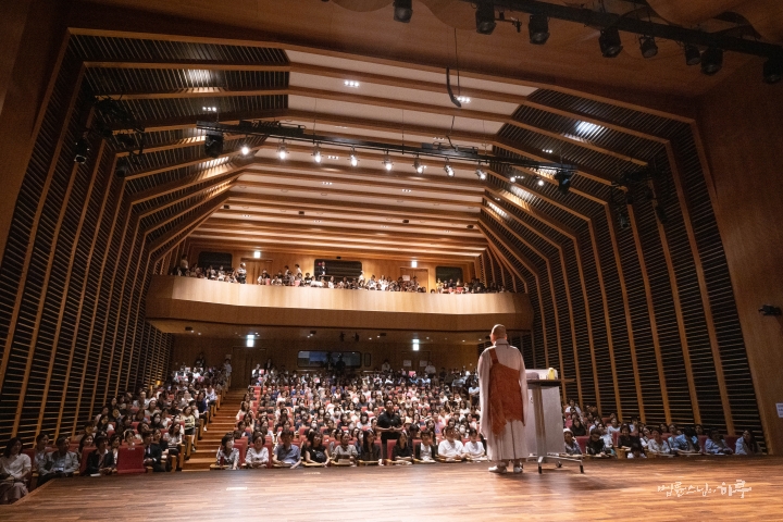 소개 영상이 끝나고 스님이 무대에 오르는 동안 400명의 청중들은 큰 박수로 환호했습니다. 스님이 웃으며 인사말을 했습니다.