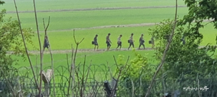 한 무리의 북한 사람들이 지나가는데 자세히 보니 농토로 가는 농민들처럼 보였습니다.