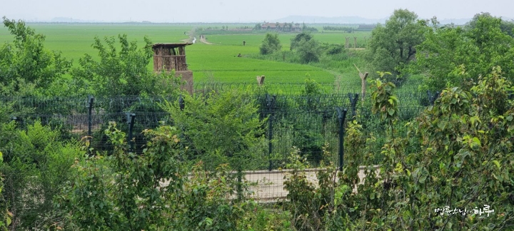 황금평이 시작되는 지점까지 올라오니 압록강 너머 북한 주민들의 모습이 보이기 시작했습니다. 근처엔 철조망과 초소도 있었습니다.