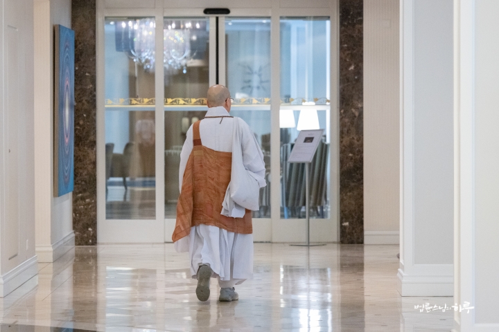 숙소에 도착한 스님은 그제서야 짐을 풀고 내일 이어질 심포지엄의 내용을 살펴본 후 원고 교정을 보았습니다. 원고 교정을 마치고 스님은 9시가 다 되어 잠시 눈을 붙였습니다. 한국과의 시차로 인해 새벽 2시부터 정토회 합동회의에 입재법문을 해야 했습니다.