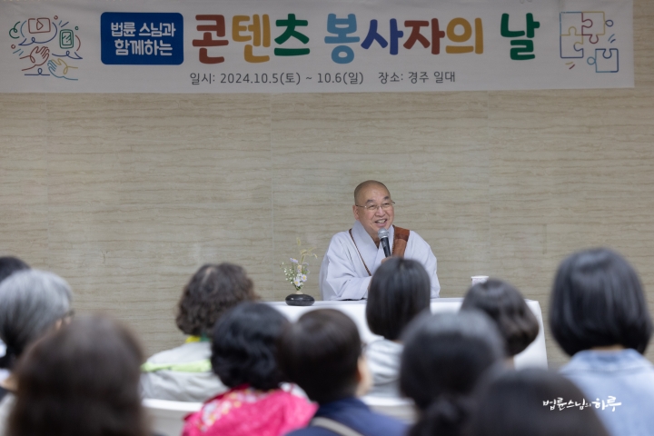 "정토회 콘텐츠 제작에 봉사하는 여러분을 이렇게 한 자리에서 만나 얼굴을 보니 반갑습니다. 사실 작년에도 콘텐츠 제작 봉사를 하는 사람들이 한번 만나서 스님과 대화도 하고 스님께서 격려도 해주면 좋겠다는 제안이 있었는데, 제 일정이 빠듯하다 보니 자리를 마련하기가 어려웠습니다. 그런데 올해 여름 공동체 수련을 하는 와중에 다시 제안이 들어왔습니다. 오프라인에서 봉사를 하는 사람들은 가끔이나마 <스님의 하루>나 <정토행자의 하루>를 통해 사진에도 나오고 활동 소식도 전해지는데, 콘텐츠 제작에 봉사하는 사람들은 음지에서 일하는 사람들처럼 햇볕을 못 본다는 거예요. 한번 만나서 햇볕을 쬐는 기회를 가지면 좋겠다는 제안이 들어와서 이런 자리를 마련하게 되었습니다. (웃음)