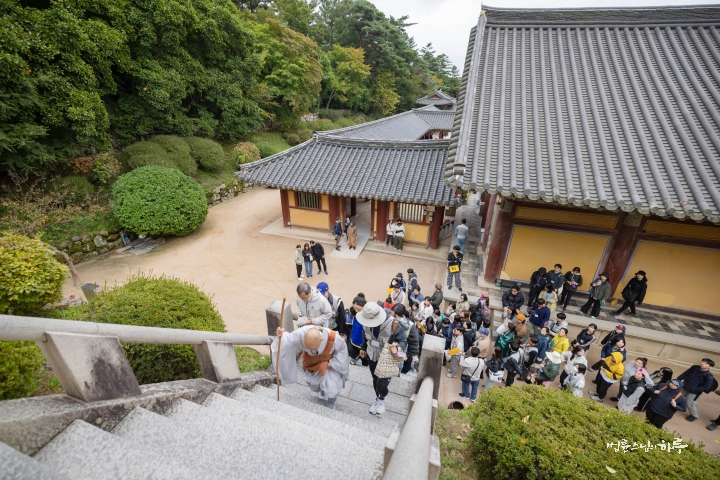 그리고 스님의 설명을 들으며 대웅전, 다보탑, 석가탑, 무설전, 관음전, 비로전, 사리탑, 나한전, 극락전을 차례대로 둘러보고 연화교와 칠보교 앞에서 불교대학, 경전대학, 청년특별지부 소속별로 기념사진을 찍었습니다.
