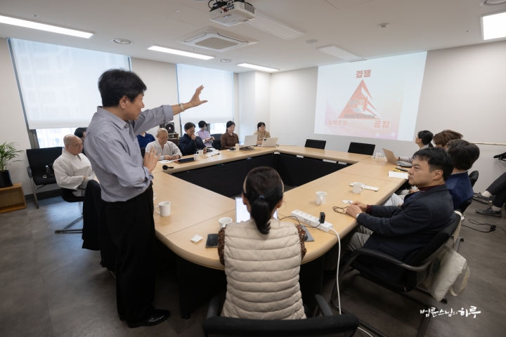 교수님은 능력주의 이데올로기와 공정 이데올로기가 경쟁 이데올로기를 가속화시키고 있는 야만의 트라이앵글이 대한민국을 무너뜨리고 있다고 강조했습니다. 스님도 발표 내용을 경청하고 소감을 이야기했습니다.