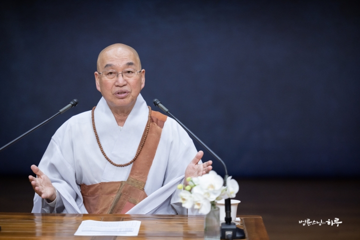 해가 저물고 저녁 7시 30분부터는 서울 정토회관 방송실에서 저녁반 회원들을 위한 수행법회 생방송을 했습니다. 정토회 회원들이 모두 화상회의 방에 입장하자 스님이 인사말을 했습니다.
