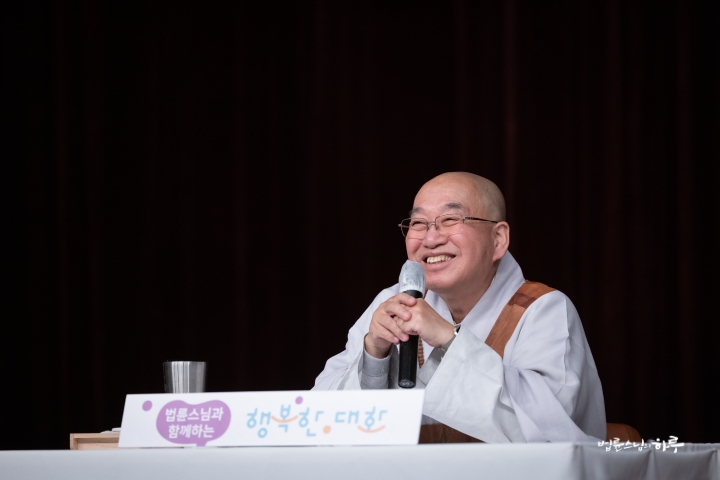 “불교 교리에 대해서 이야기하는 것만이 법담이 아니고, 우리가 일상생활에서 겪고 있는 괴로움에 대해 이야기를 나누어서 그 고통이 사라진다면 그것을 법담이라고 말할 수 있습니다. 여러분들이 갖고 있는 의문이나 스트레스 같은 것들을 내어놓고 대화를 나누는 자리입니다. 저와 둘이 대화하는 것처럼 보이지만 여기 모인 350명의 사람들이 함께 들으면서 고개를 끄덕이기도 하고, 고개를 가로 젓기도 하면서, 모두 함께 참여해서 만들어가는 법담의 장이라고 할 수 있습니다. 질문하는 사람이 부부간의 갈등이나 자식 문제를 이야기하더라도 ‘저 집에는 문제가 있구나’, ‘저 집은 부부싸움을 하네’ 이렇게 보시면 안 됩니다. 질문은 법담의 소재일 뿐입니다. 질문을 통해서 우리가 인생을 어떻게 살아야 하는지에 대해 깨달아 나갈 수가 있습니다. 이제 여러분들의 이야기를 들어보겠습니다.”