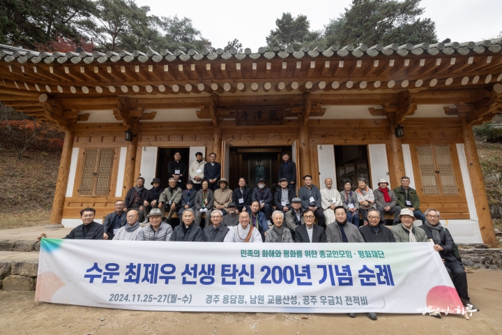 안녕하세요. 오늘부터 2박 3일 동안 여러 종교 지도자들과 사회 인사들을 모시고 수운 최제우 대신사 탄생 200주년 기념 순례를 다니기로 했습니다. 오늘은 순례 1일째 날로 수운 최제우 대신사의 발자취를 따라 생가와 묘소를 방문하며 동학사상의 뿌리를 되새겼습니다.