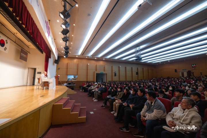 노래가 끝나고 곧바로 큰 박수와 함께 스님이 무대에 올랐습니다. 강연장에는 350여 명의 청중이 모였고, 스님이 인사말을 했습니다.