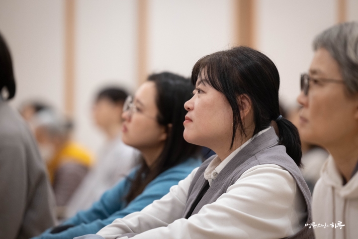 저녁 7시 30분에는 저녁반 회원들을 위한 열린법회 제7강을 시작했습니다. 3층 설법전에는 직장에서 퇴근하고 달려온 110여 명의 대중들이 자리했습니다.