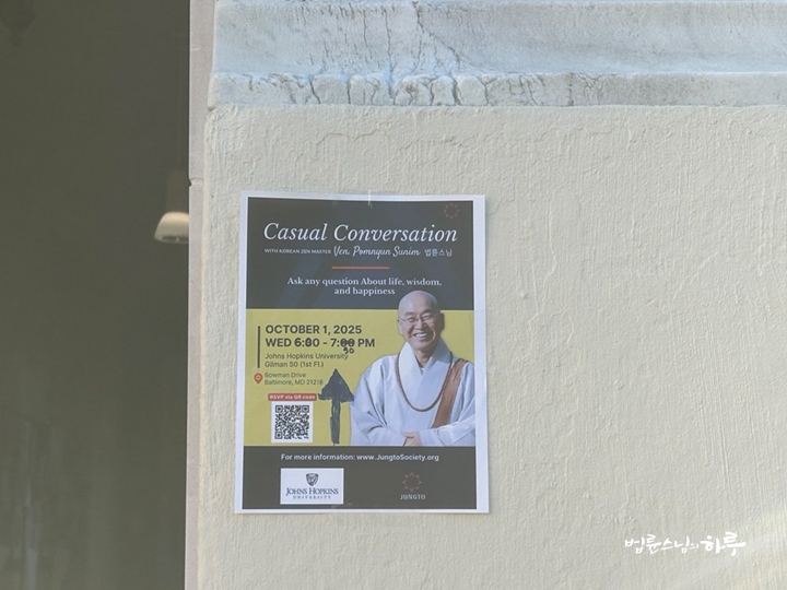 오늘 강연이 열리는 곳은 존스 홉킨스 대학교(Johns Hopkins University) 홈우드 캠퍼스에 있는 길먼 홀(Gilman Hall)입니다. 존스 홉킨스 대학교는 1876년 상인 존스 홉킨스의 유산으로 설립된 미국 최초의 연구 중심 대학교입니다. 현재 미국에서 가장 많은 연구 기금을 받는 교육 기관 중 하나로 인정받고 있습니다. 스님은 그동안 워싱턴 D.C.에 위치한 존스 홉킨스 대학 국제학 대학원(School for Advanced International Studies)을 방문하여 강연을 했습니다. 볼티모어에 위치한 홈우드 캠퍼스 방문은 이번이 처음입니다.