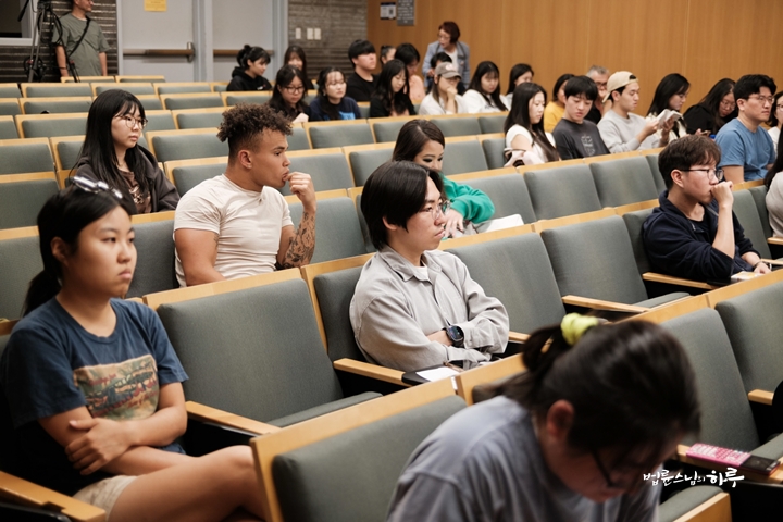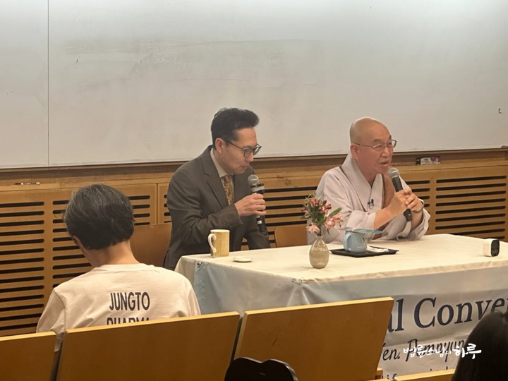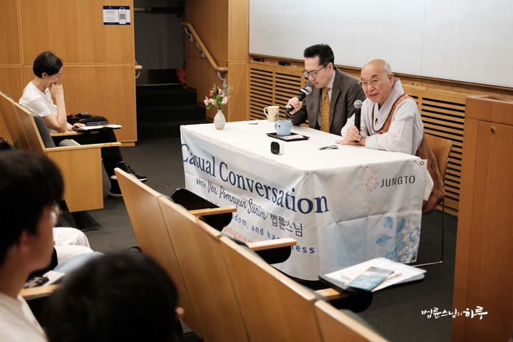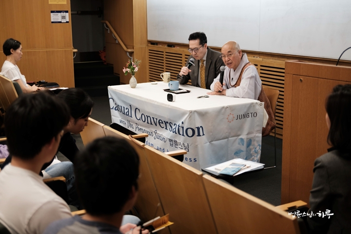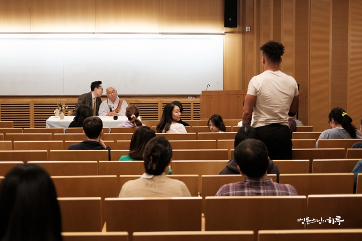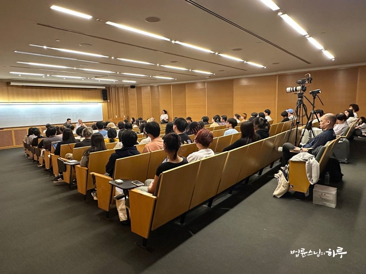 저녁 6시가 되어 김수정 교수의 사회로 강연을 시작했습니다. 100여 명이 참석한 가운데 큰 박수와 함께 스님이 무대 위로 올라왔습니다. 스님이 웃으며 인사말을 했습니다.