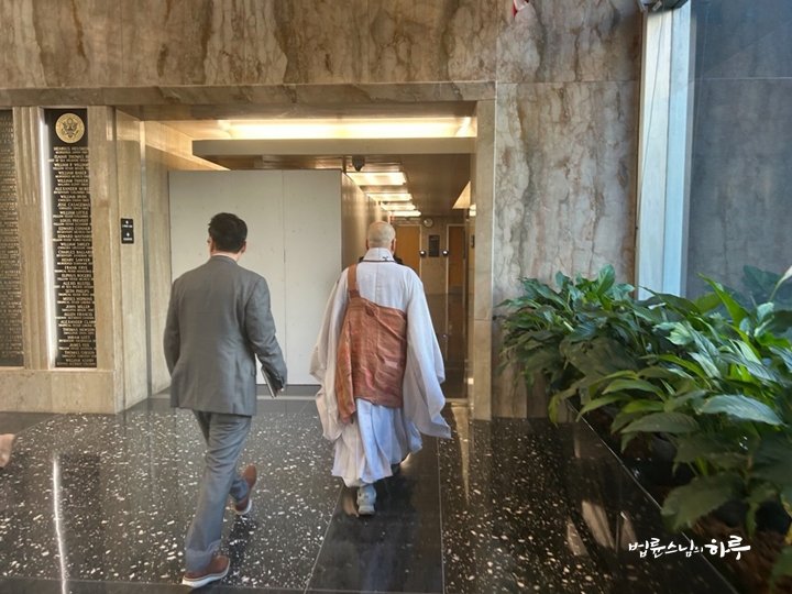 안녕하세요. 미주 정토회관의 아침이 밝았습니다. 오늘은 워싱턴 D.C.를 방문하는 3일째 날입니다. 스님은 미국 국무부를 방문하여 북미 관계 개선에 대해 대화를 나누고, 볼티모어에 있는 존스 홉킨스 대학교에서 영어 통역으로 즉문즉설 강연을 했습니다.