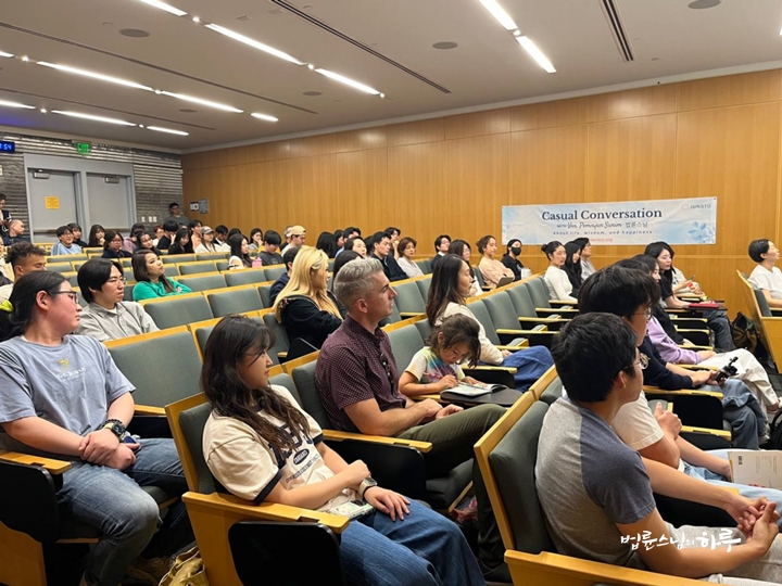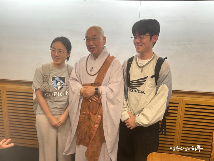 대부분이 한국계, 중국계, 베트남계 등 아시안들이 많았지만 간혹 비아시안계 학생들도 참석했습니다. 강연은 예정 시간을 10분 넘겨 1시간 40분간 진행되었습니다. 마지막으로 스님이 학생들을 격려하는 말을 해주었습니다.