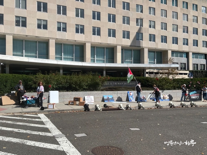 공무원들이 출근하지 않으니 차가 막히지 않을 것이라 생각했지만 평소 50분 정도 걸리는 거리를 1시간 10분이 걸려 제시간에 도착했습니다. 국무부 건물에 도착하자 정문 앞에서 많은 사람들이 이스라엘의 가자 지구 공습을 반대하는 시위를 하고 있었습니다. 백악관 앞에는 일상적으로 시위가 있지만, 국무부 앞에서 시위가 일어나는 것은 자주 보지 못했습니다. 작년 5월 방문 때에도 가자 지구 폭격을 반대하는 시위를 하고 있었는데 오늘은 실제로 가자 지구에 울려 퍼지는 것과 똑같은 공습 경보를 울리는 퍼포먼스를 진행하고 있었습니다.