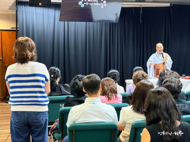이어서 누구든지 손을 들고 스님에게 질문하는 시간을 가졌습니다. 샌안토니오에 사시는 분은 5시간을 걸려서 질문하러 왔다고 했습니다. 두 시간 동안 아홉 명이 스님과 대화를 나눌 수 있었습니다. 그중 한 명은 20대 중반이 된 자녀들이 여전히 부모에게 의지하고 있어, 이제라도 아이들이 스스로 설 수 있도록 돕는 방법을 물었습니다.