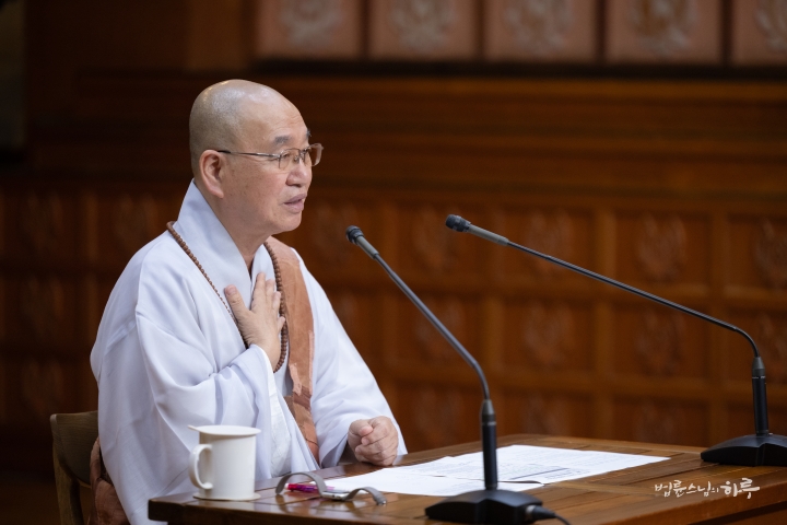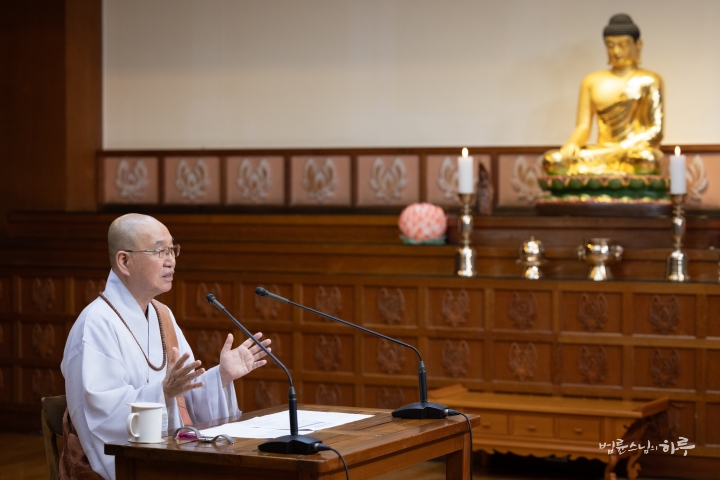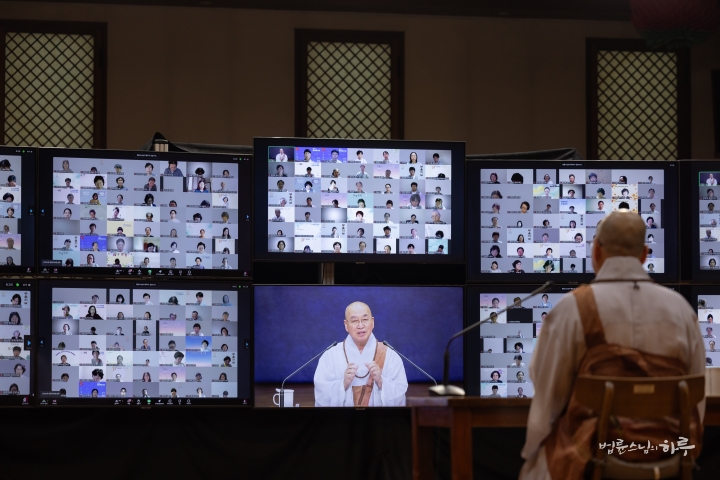 그래서 정토회에서는 매년 6월과 10월, 두 차례의 정진 기간을 정해 ‘정일사 수련’을 진행하고 있습니다. 이는 일상 속에서 스스로 어려움을 극복해 보는 수행의 경험을 쌓기 위한 것입니다. 예전처럼 법당에 모여 함께 정진하고 나눌 수 있다면 더없이 좋겠지만, 지금은 온라인으로 전환된 시대입니다. 그러므로 ‘내가 사는 집이 곧 법당이다’라는 마음으로, 남이 보든 보지 않든 온라인으로 연결해 각자 자신의 정진을 꾸준히 이어가면 됩니다.