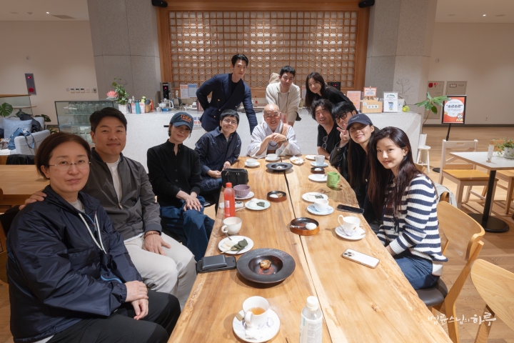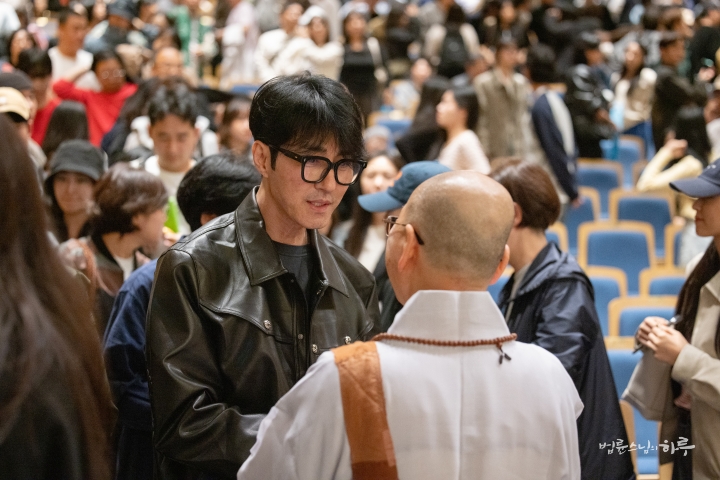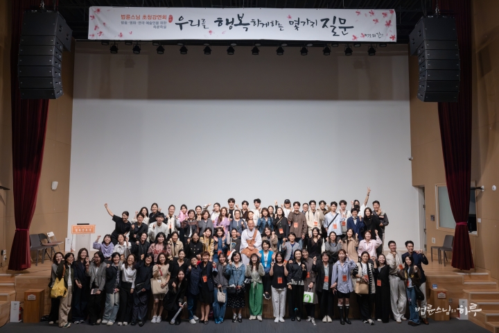 대화를 나누다 보니 어느덧 강연을 시작할 시간이 되었습니다. 스님은 배우들과 함께 기념사진을 찍은 후 지하 대강당으로 이동했습니다.
