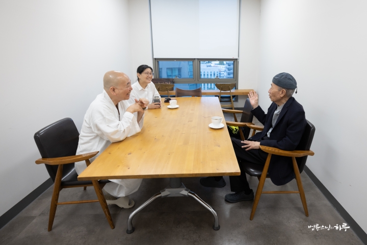 이어서 10시에는 대화문화아카데미 강대인 명예 원장님이 찾아와 접견실에서 미팅을 했습니다. 강대인 원장님은 대화문화아카데미 60주년 기념행사를 12월에 개최하는데 스님이 꼭 참석해 주었으면 좋겠다고 요청했습니다. 스님은 흔쾌히 참석하겠다고 대답한 후 최근 미국을 방문하고 온 결과를 공유하면서 한반도 평화를 위해 사회 원로들이 어떤 역할을 해나가면 좋을지 원장님과 많은 대화를 나누었습니다.